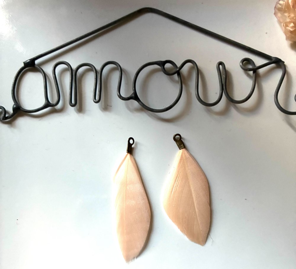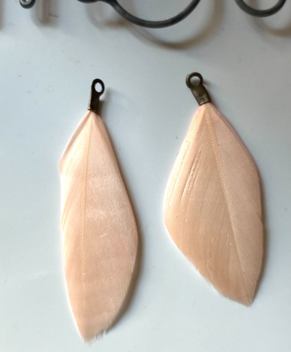 Cette plume mesure environ 4-5cm, en saumon avec accroche et piquot en bronze, chaque plume est différente mais je peux essayer de vous en trouver des similaires pour des Boucles d'oreilles harmonieuses, n'hésitez pas à me contacter !