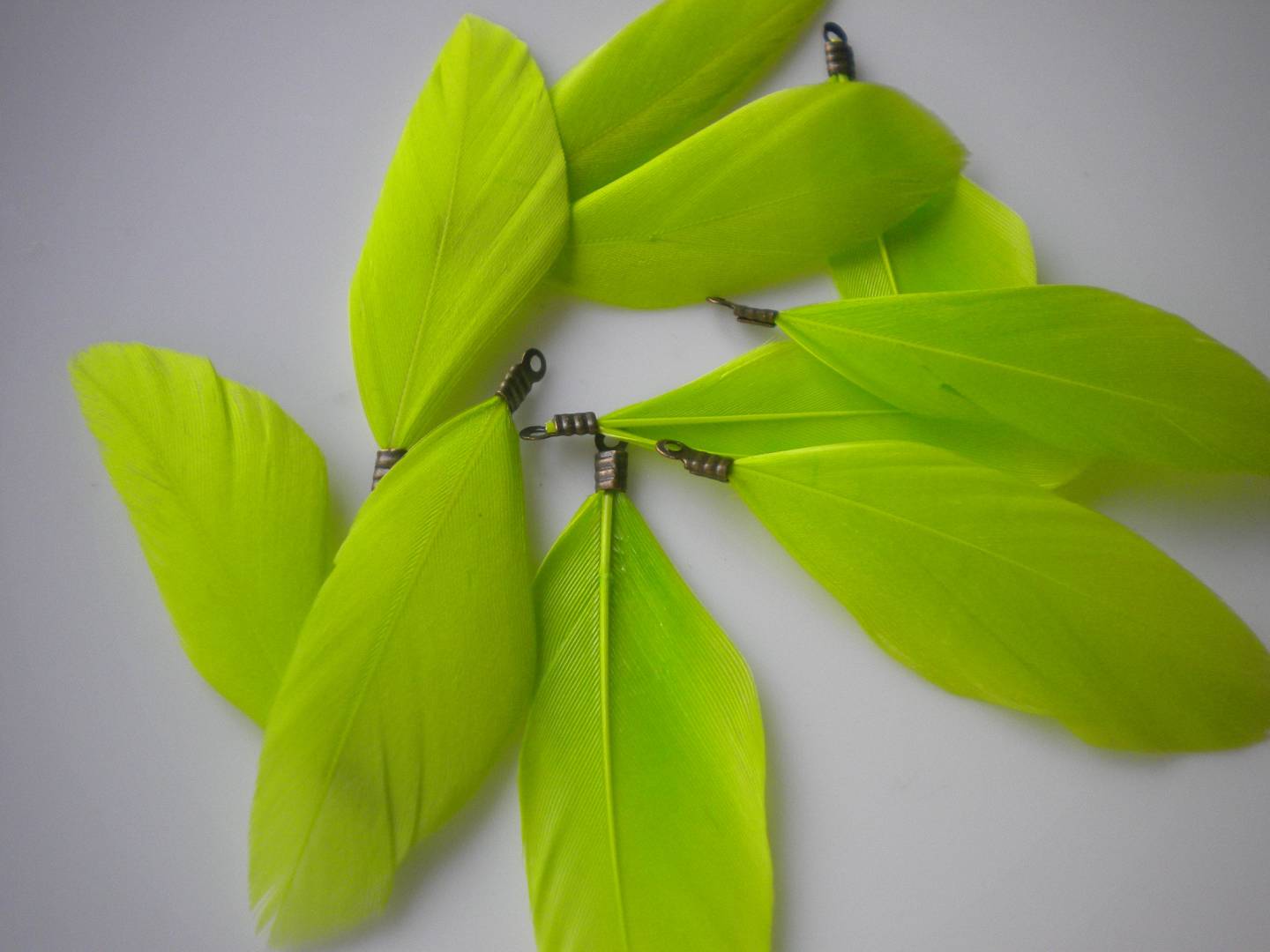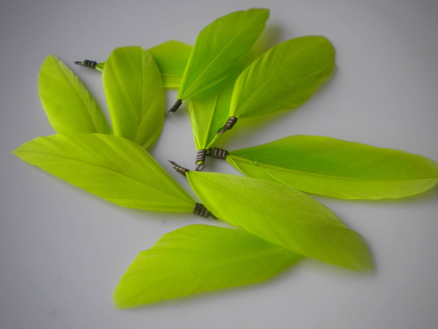 Cette plume mesure environ 4-5cm, en vert anis avec accroche et piquot en bronze, chaque plume est différente mais je peux essayer de vous en trouver des similaires pour des Boucles d'oreilles harmonieuses, n'hésitez pas à me contacter !