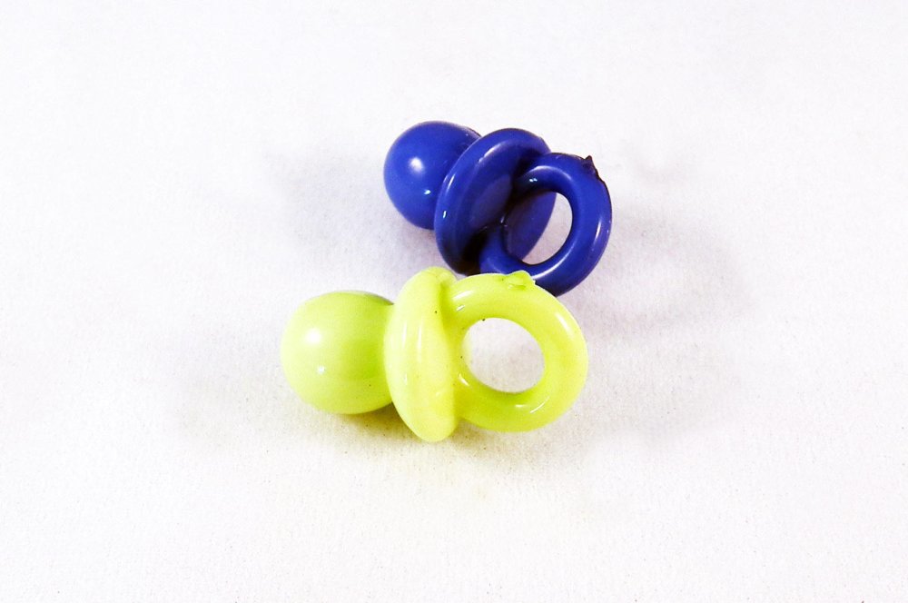 2 Pendentifs Breloques en forme de suce sucette pour bébé, Acrylique, Bleu et Jaune, 2cm X 1cm.