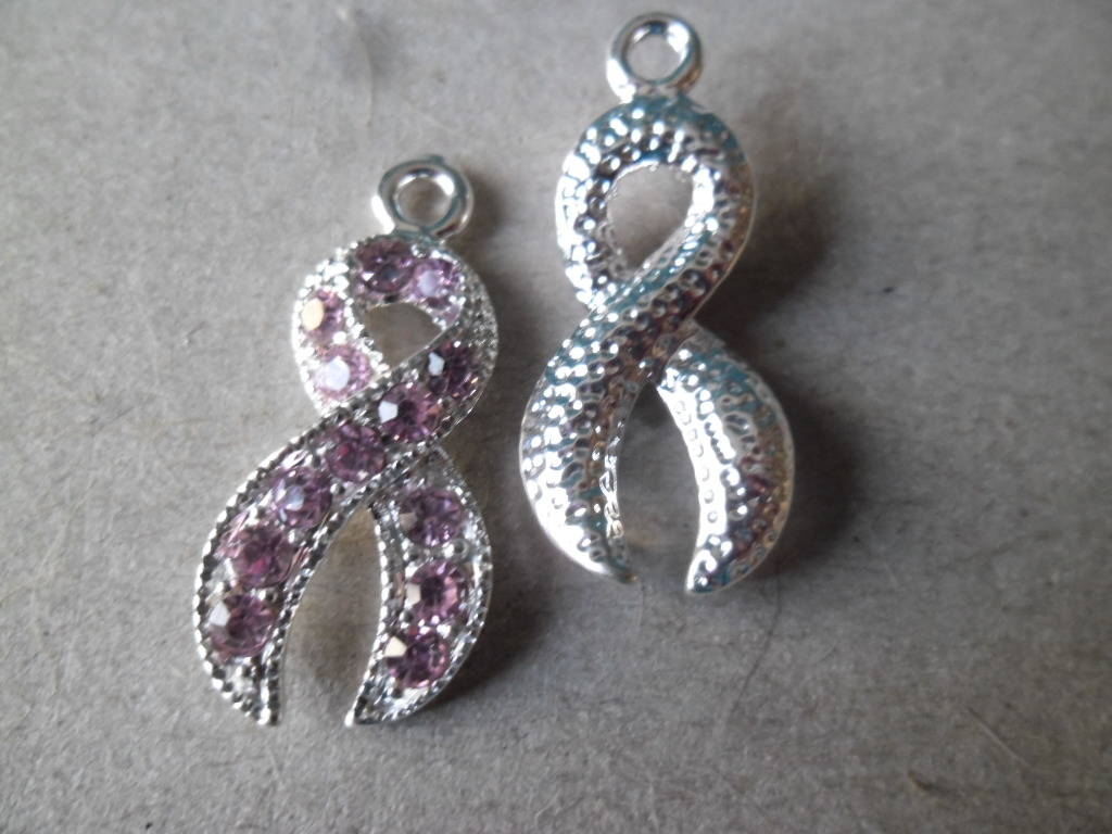 ce très beau pendentif en forme de ruban incrusté de strass de couleur rose en métal argenté.