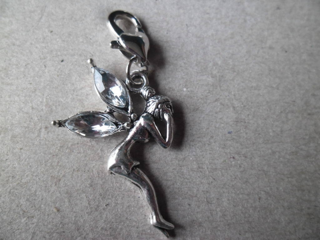 ce très beau lot de 2 pendentifs en forme de fée à strass de couleur blanc avec fermoir mousqueton en forme de cœur en métal argenté.