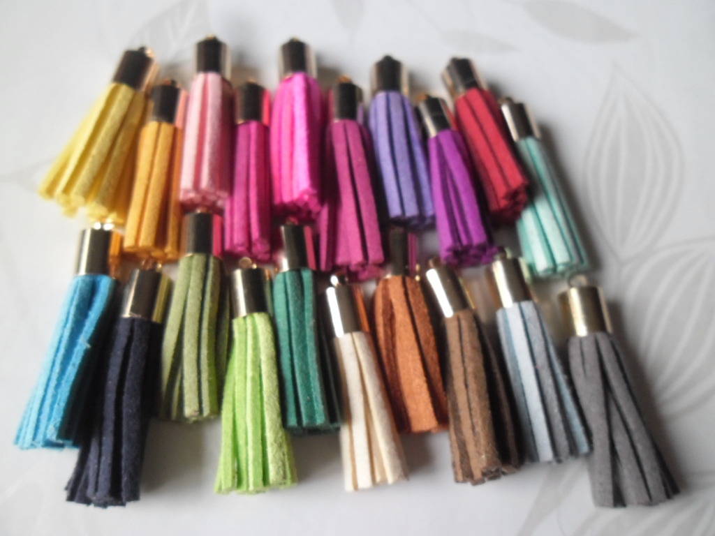 ce très beau lot de 20+2 offerts mixte pendentifs pompon en suédine de 20 couleurs différentes avec gland plastique doré.
