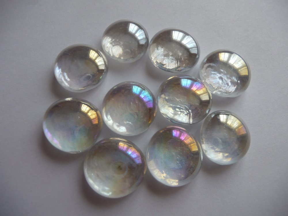 Je vous propose un ensemble de 10 cabochons en verre transparent irisé , fond plat, forme arrondie (environ 1,7 cm de diamètre). Les tailles et formes peuvent varier d'un cabochon à l'autre.