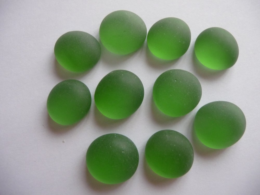 Je vous propose un ensemble de 10 cabochons en verre, couleur verte, aspect givré, fond plat, forme arrondie (environ 1,7 cm de diamètre). Les tailles et formes peuvent varier d'un cabochon à l'autre.