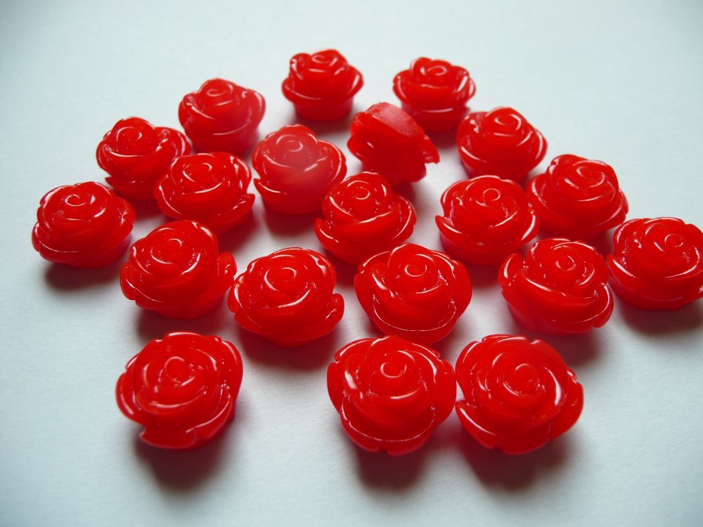 Je vous propose un ensemble de 10 perles-cabochons forme fleur (rose) en résine, couleur rouge, d'environ 15 mm de diamètre, trouées (à utiliser comme perles), fond plat (si vous préférez les utiliser comme cabochons.