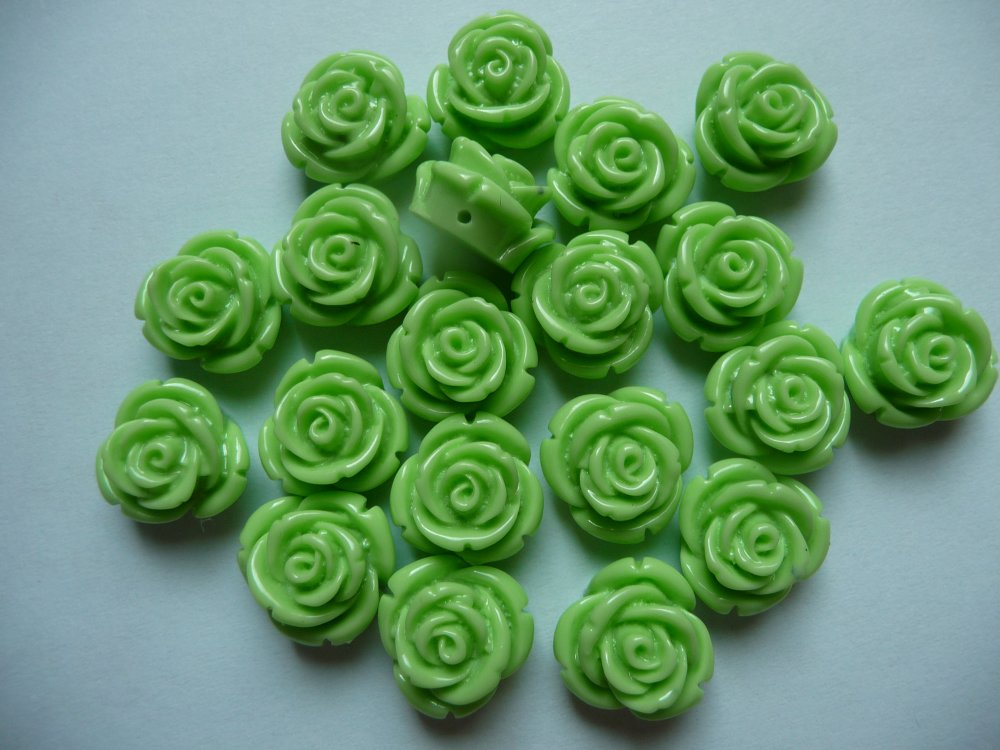 Je vous propose un ensemble de 10 perles-cabochons forme fleur (rose) en résine, couleur vert-pomme, diamètre environ 15 mm, trouées (à utiliser comme perles, avec fond plat (si vous les utilisez en tant que cabochons).