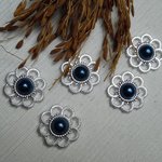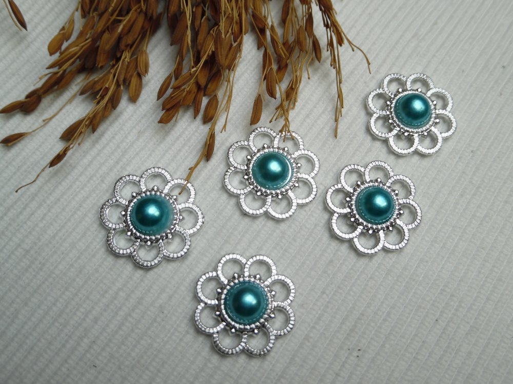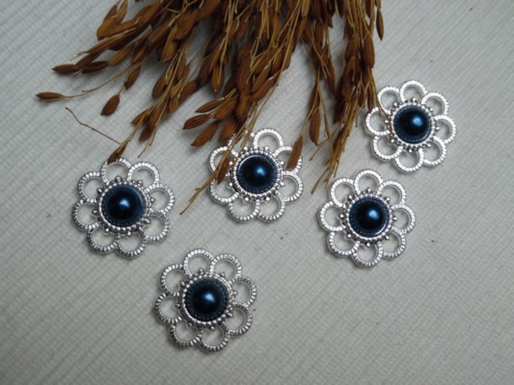 Lot de 3 Cabochons BLEU MARINE demi-perle à Coudre ou Coller forme de Fleur Argenté 26x7.5mm Acrylique