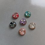Cabochon rond blanc, avec éclats de coquillage, en résine. Dimensions : 14mm, épaisseur 5,5mm - A l'unité ou en lot de 10 pièces