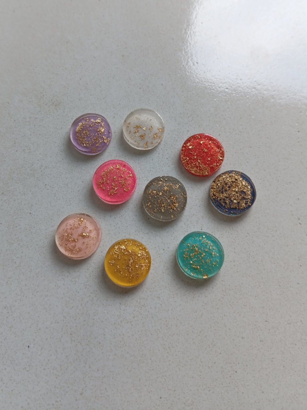 Cabochon rond plat gris, avec feuille d'or, en résine.