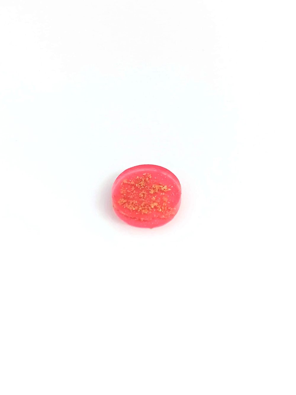 Cabochon rond plat rose, avec feuille d'or, en résine.