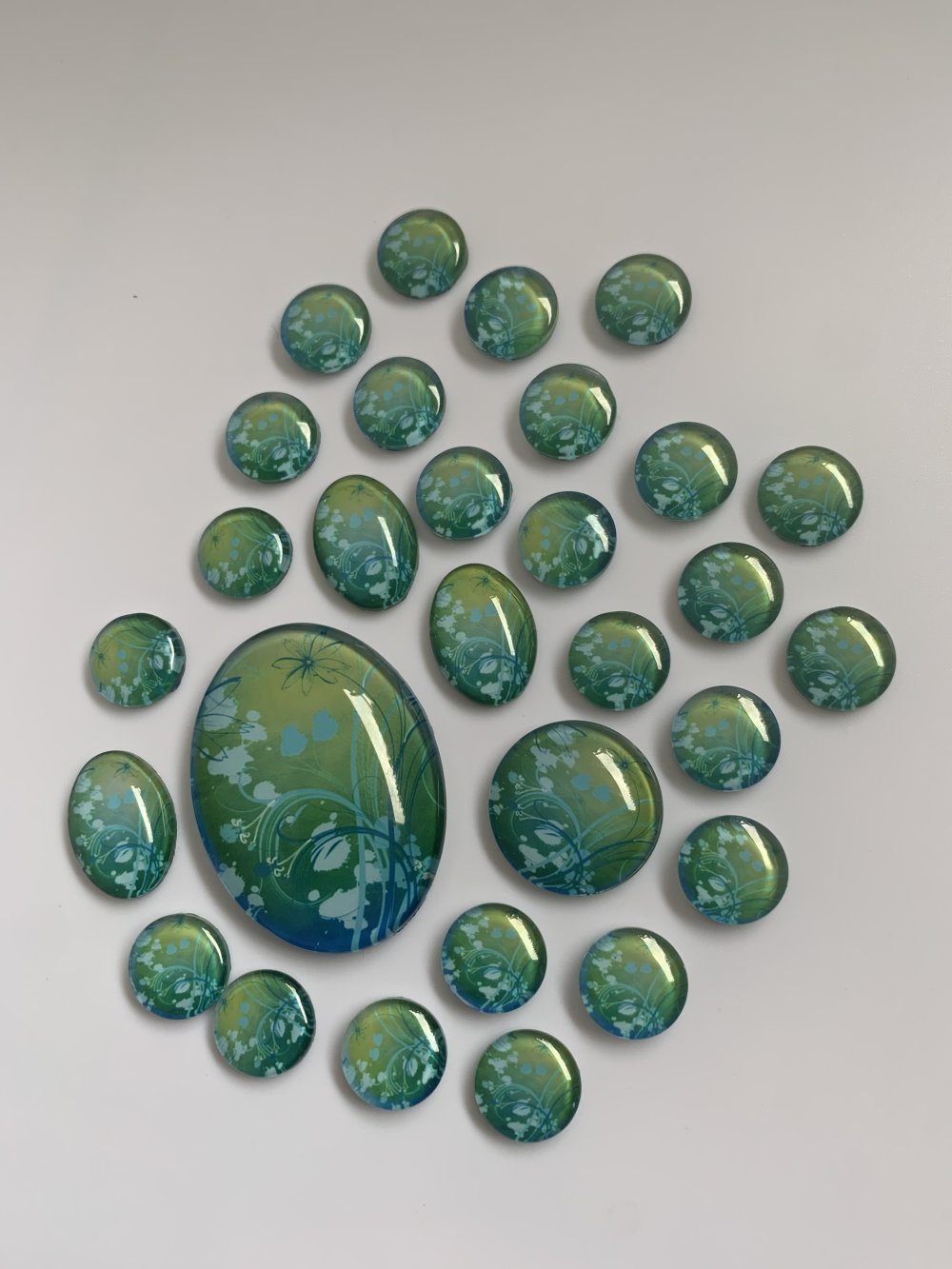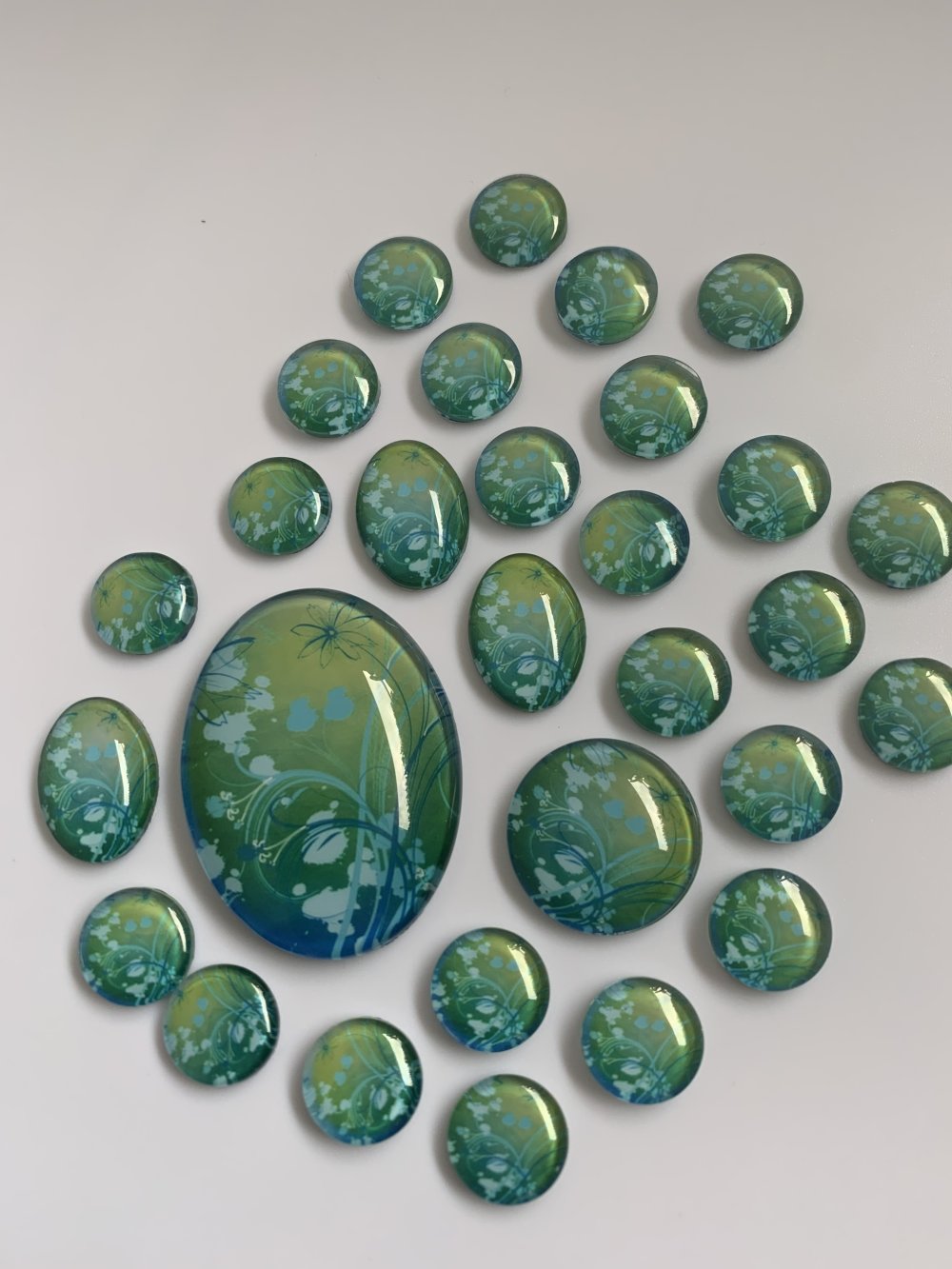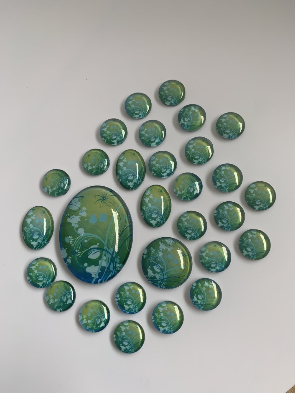Lot de cabochons,tous assortis,de dimensions diverses ,29pieces ,1 de 40x30 , 1 de 20 mm , 3 de 13 x18 mm , et 24 de 12 mm ,en verre