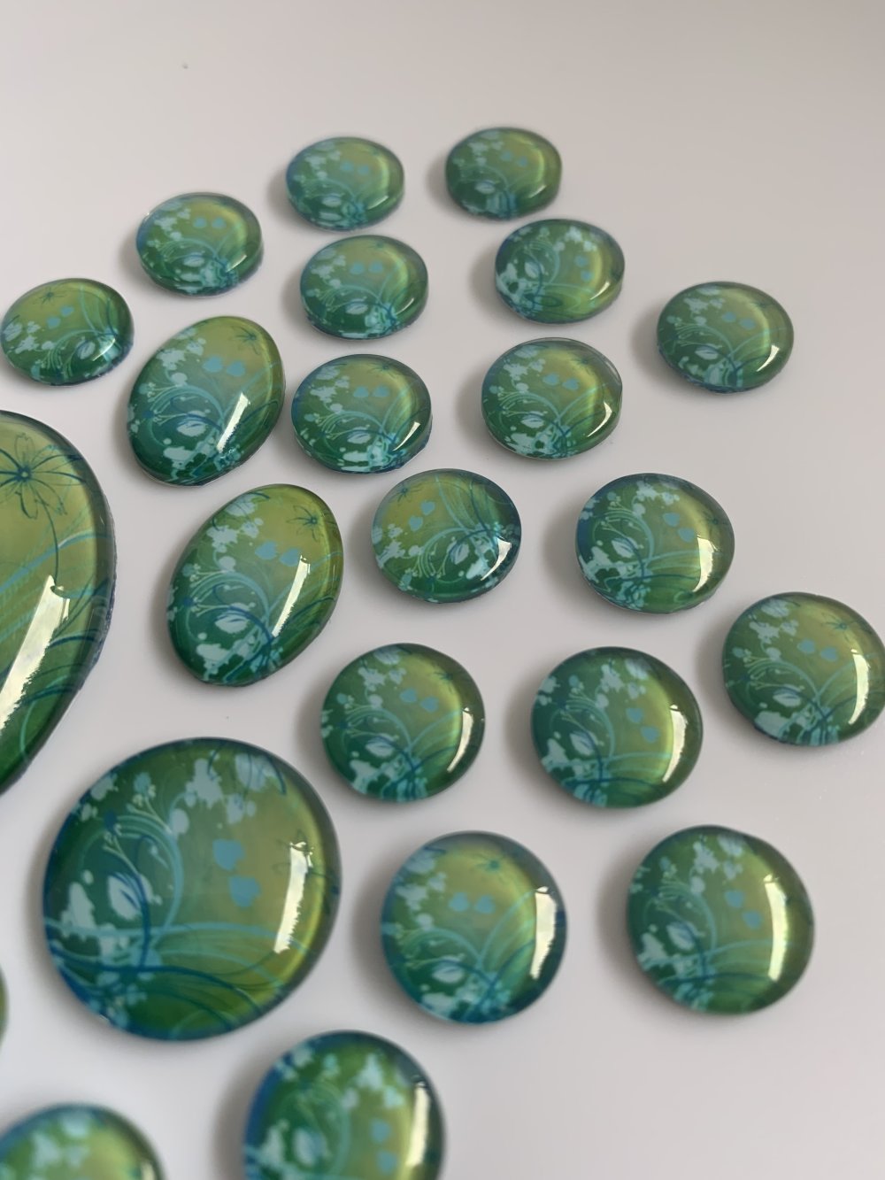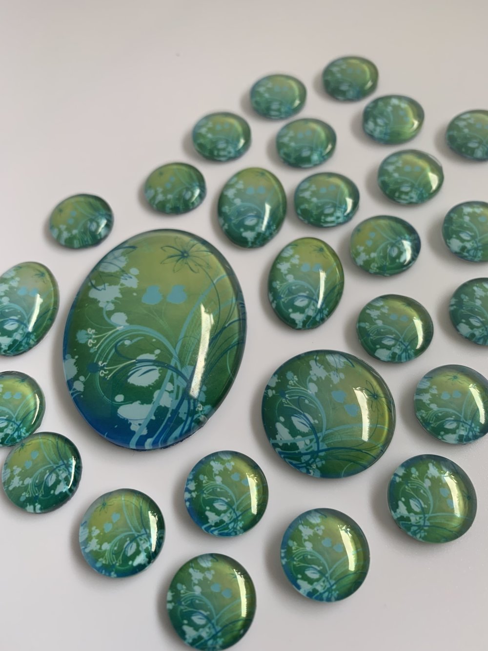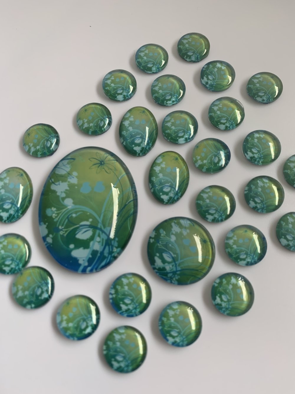 Lot de cabochons,tous assortis,de dimensions diverses ,29pieces ,1 de 40x30 , 1 de 20 mm , 3 de 13 x18 mm , et 24 de 12 mm ,en verre