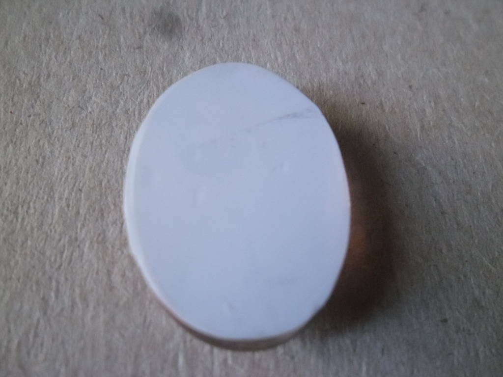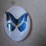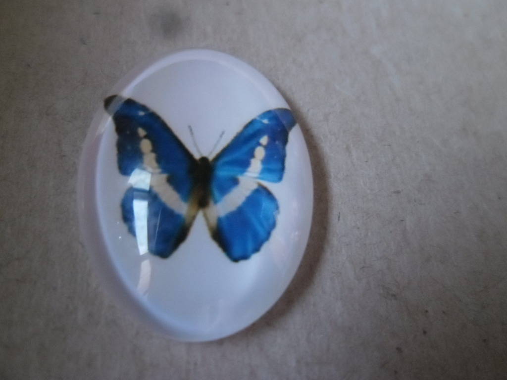 ce très beau camée/cabochon en verre bombé de forme ovale à motif papillon bleu fond blanc .