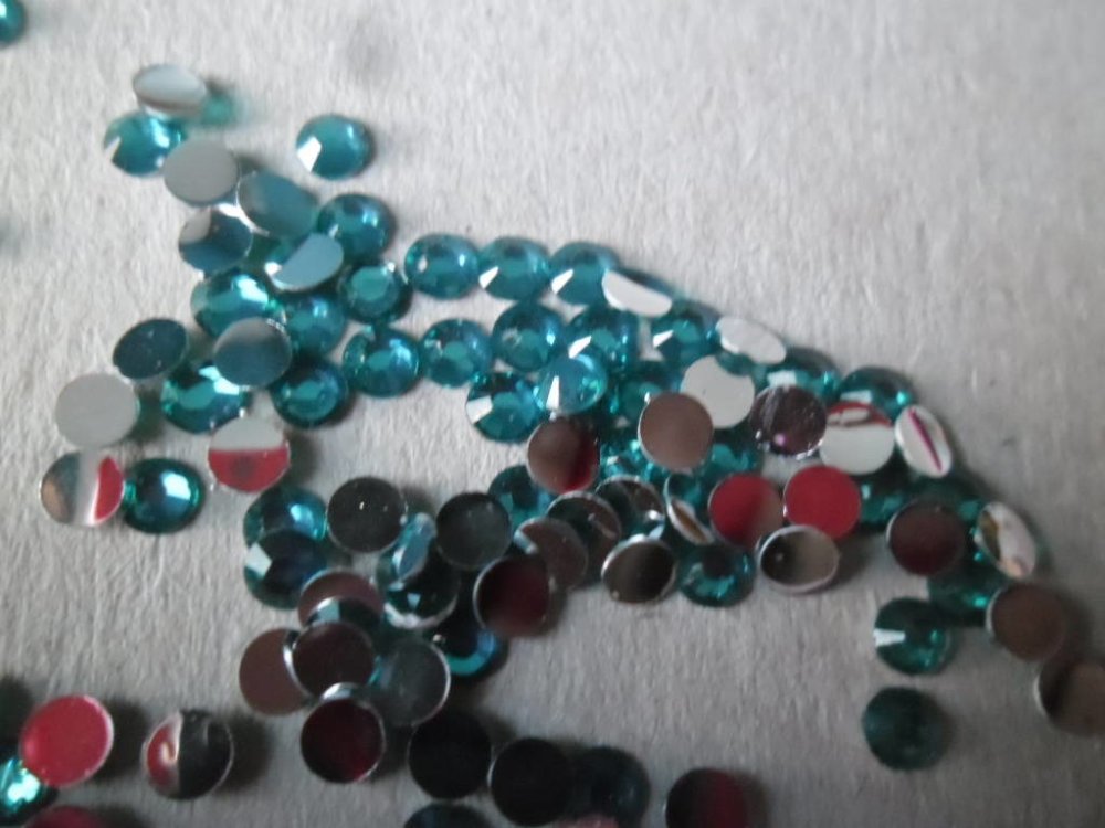 ce très beau lot de 100 demi-perles strass cristal de couleur bleu paon facettes à coller.