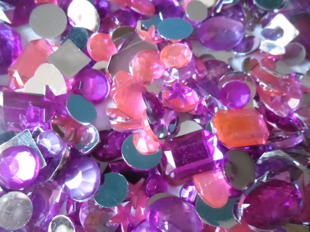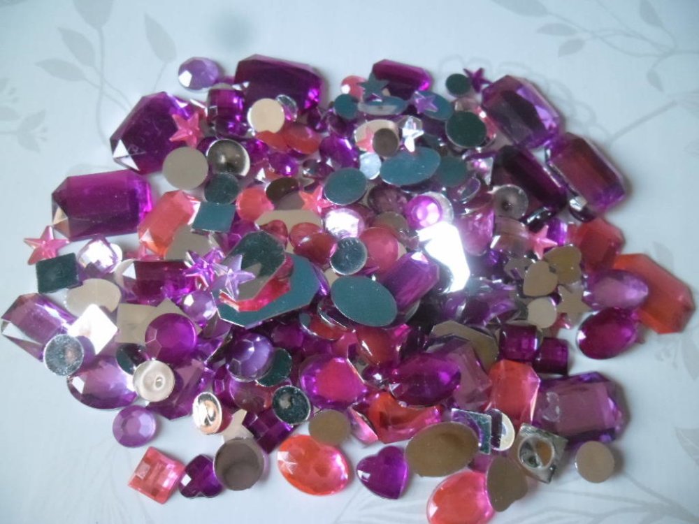 ce très beau lot de 285 mixte strass/diamants ton rose/rose foncé à facette de différentes formes: étoile/coeur/rond/rectangle/ovale/carré à coller en acrylique.
