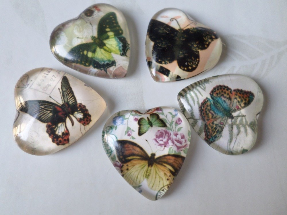x 5 mixte camée/cabochon coeur en verre motif papillons multicolore
