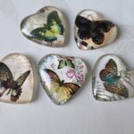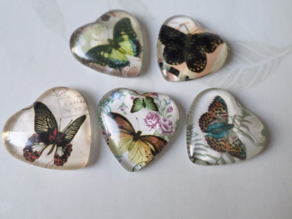 ce très beau lot de 5 mixte camée/cabochon en forme de coeur en verre à motif papillons multicolore.