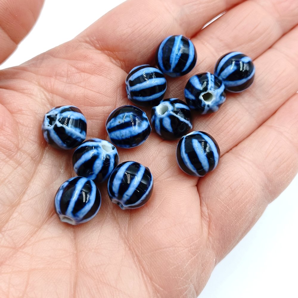 10 Perles porcelaine ronde rayée ~10mm bleu