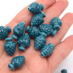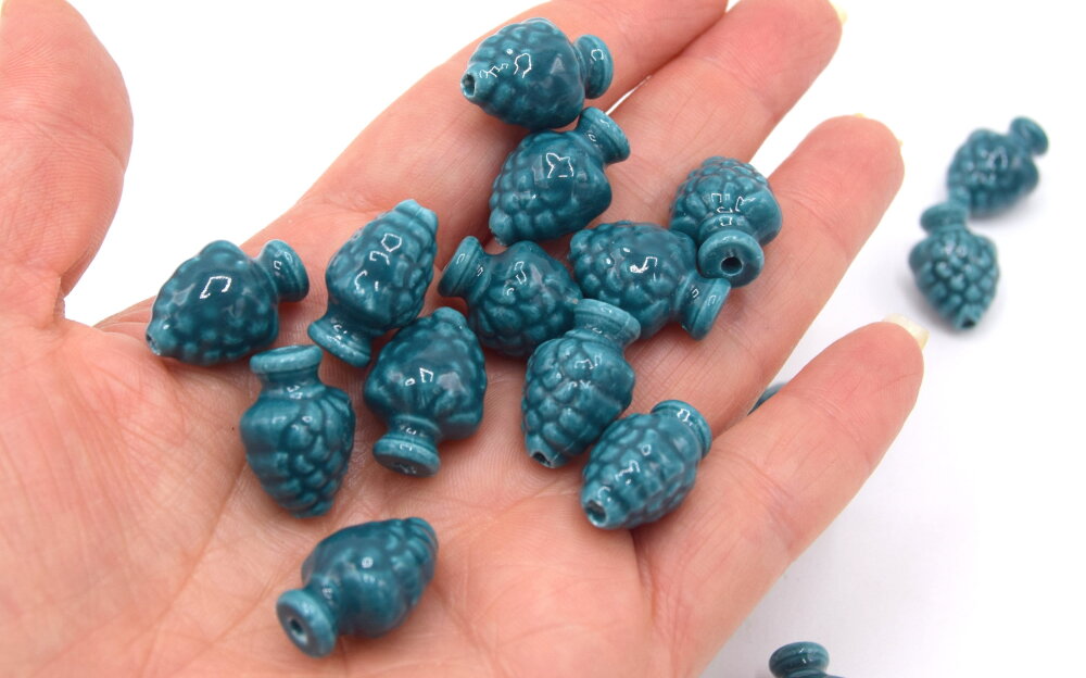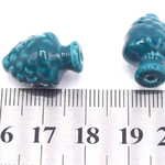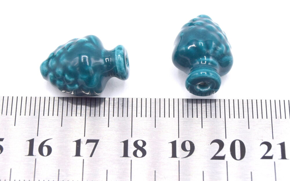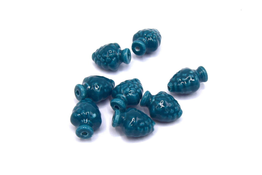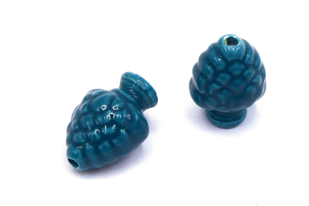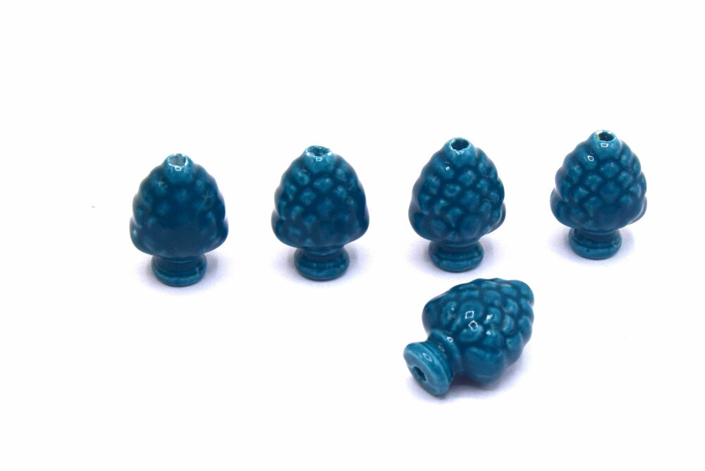 5 Perles en céramique émaillée lumineux, pomme de pin bleu roi.