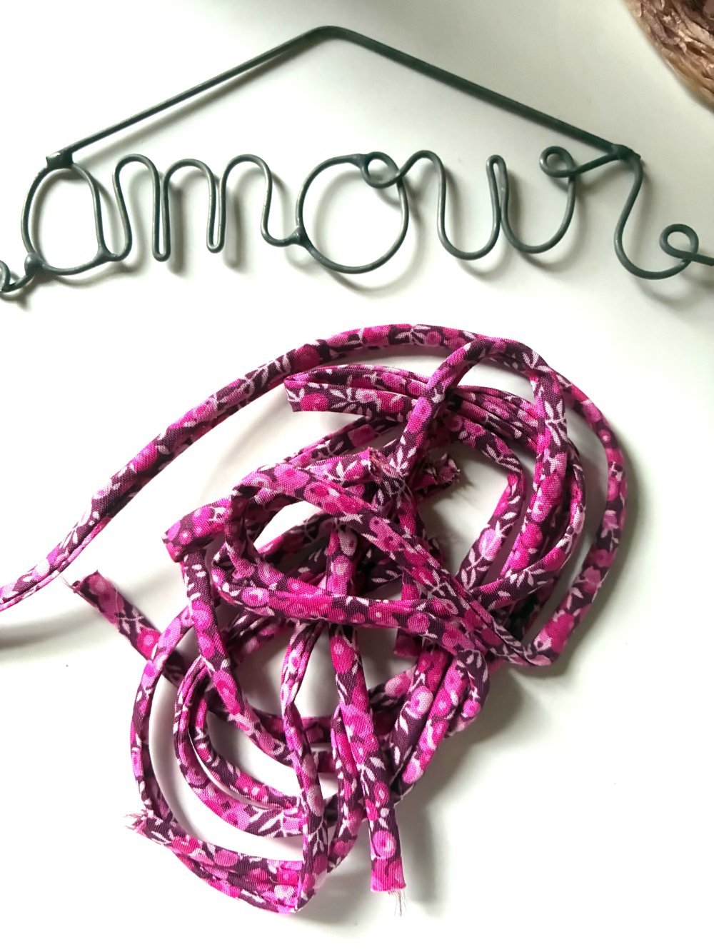 Ce lot est composé de 5 coupons déjà coupés de cordon liberty Wilmslow Berry violet et rose,