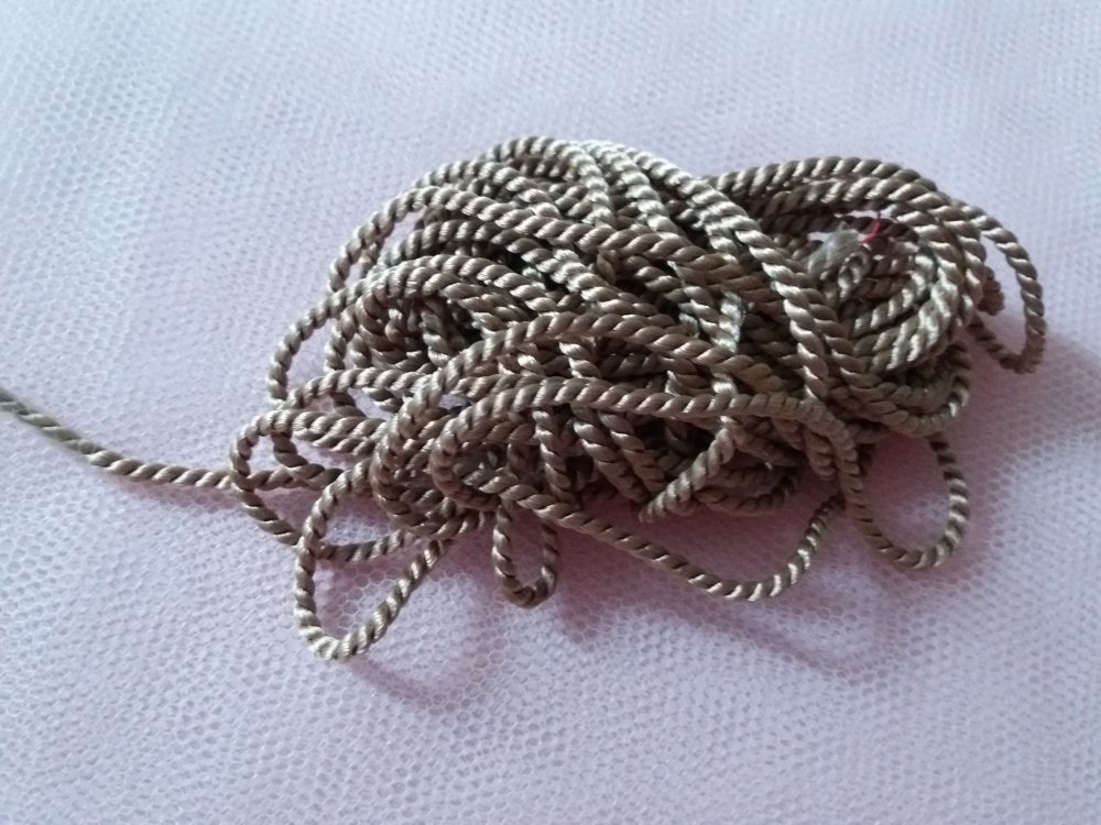 Je vous propose ce galon cordelette satinée torsadée, marron clair/doré, d'une longueur de 4,5 m sur un largeur d'environ 3 mm.