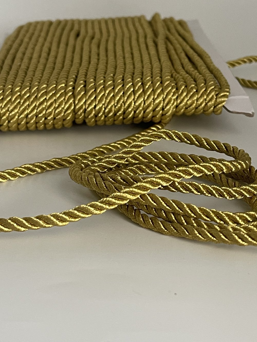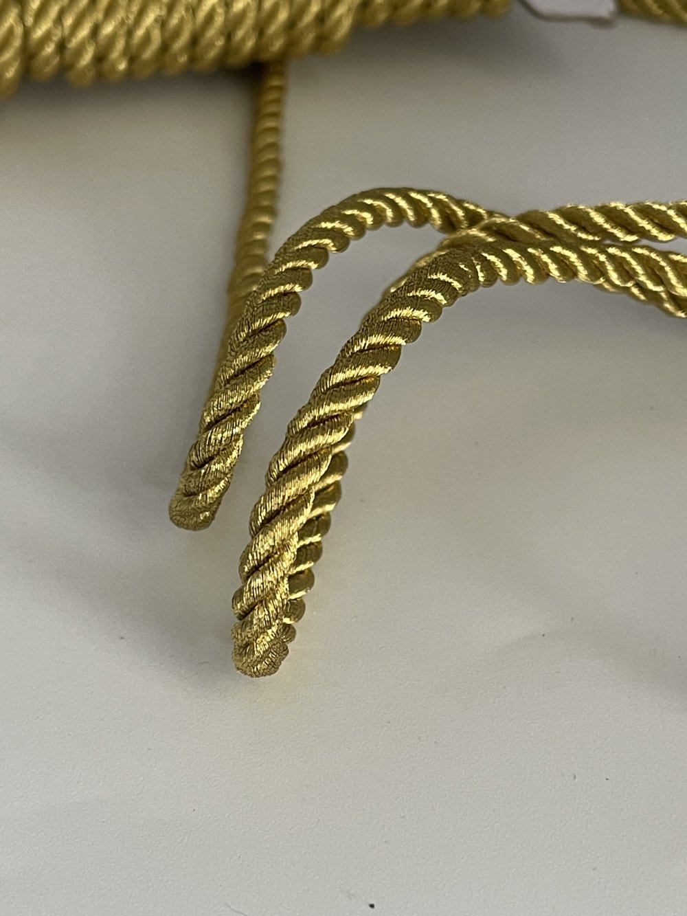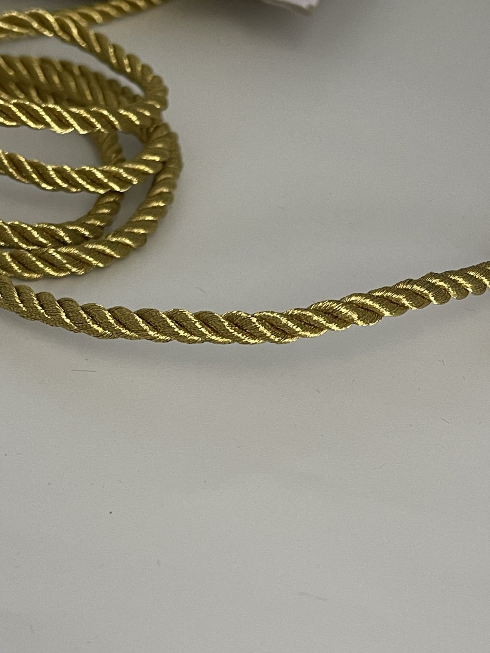 Cordon torsadé brillant d’environ 5 mm de diamètre, disponible en doré ou argenté.