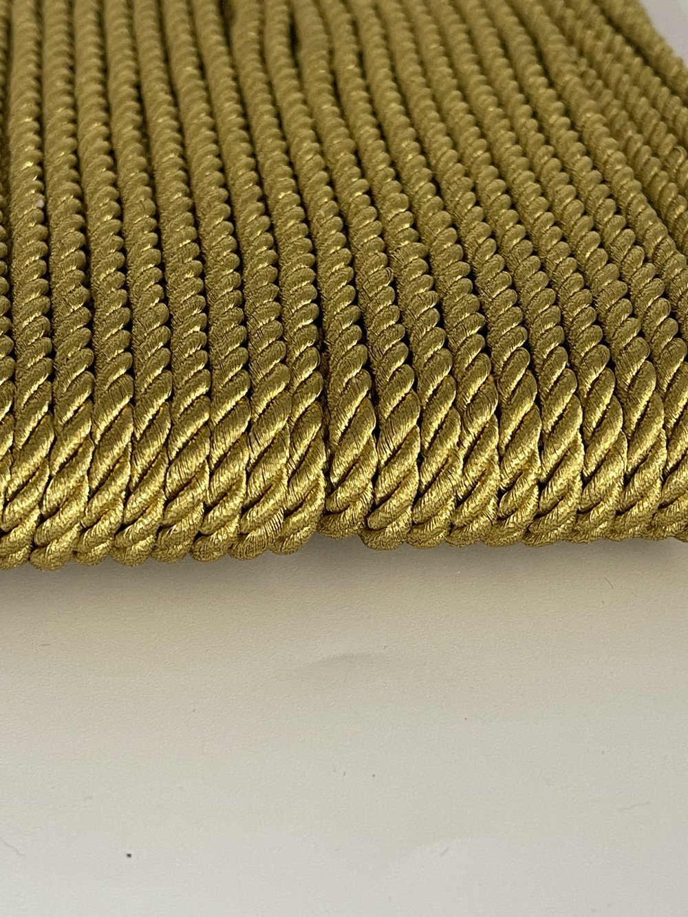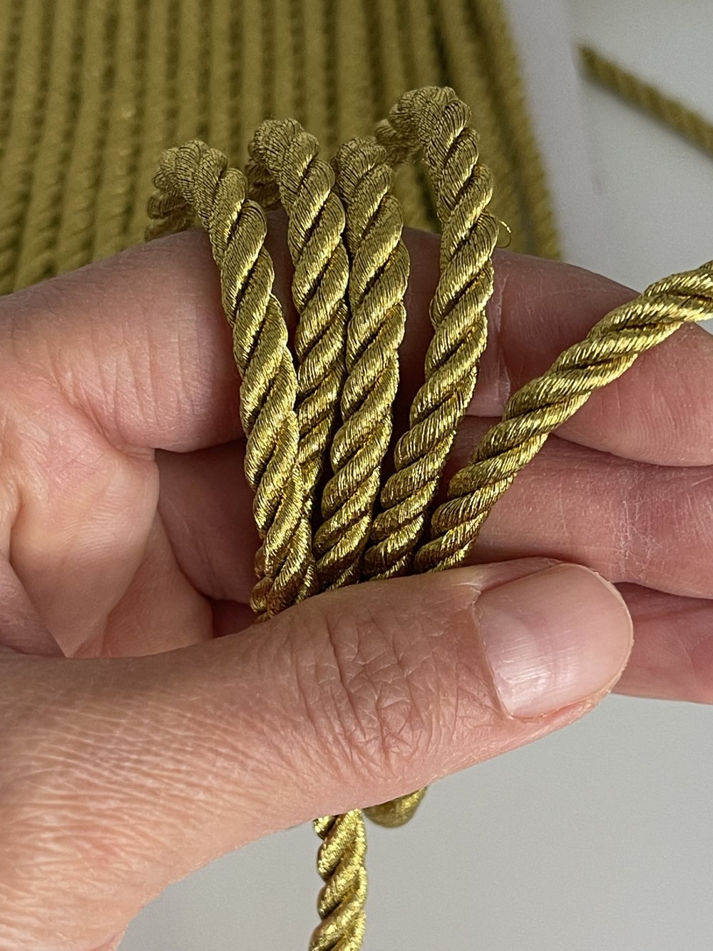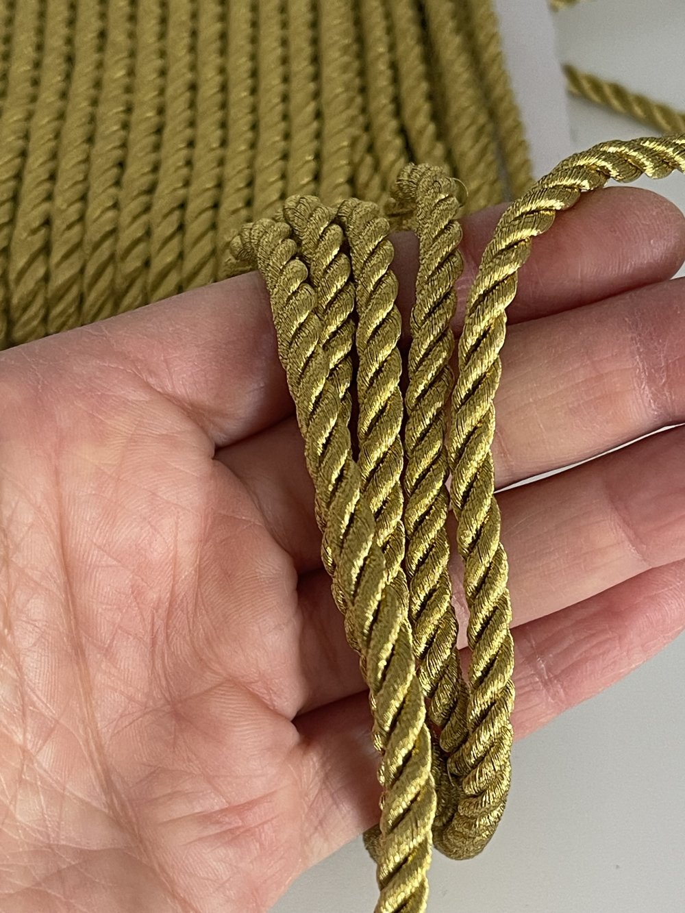 Cordon torsadé brillant d’environ 5 mm de diamètre, disponible en doré ou argenté.
