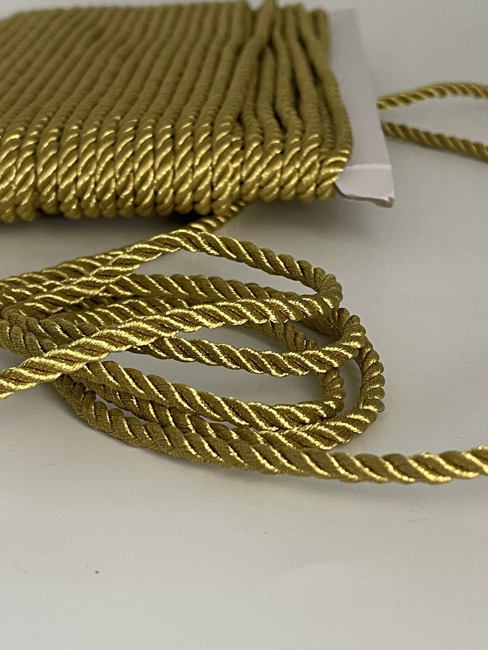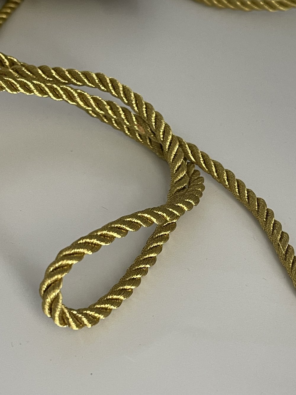 Cordon torsadé brillant d’environ 5 mm de diamètre, disponible en doré ou argenté.