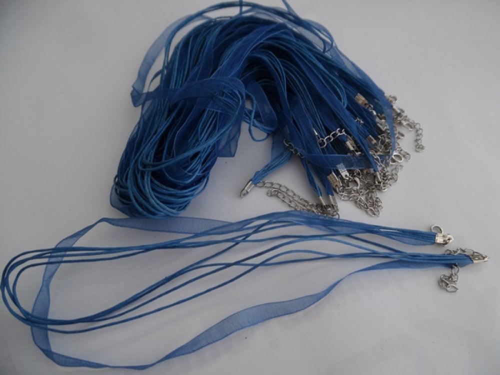 1 Collier corde violet ruban organza bleu foncé 43cm fermoir mousqueton de 12mm et petite chainette.