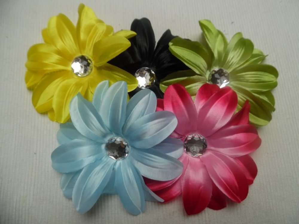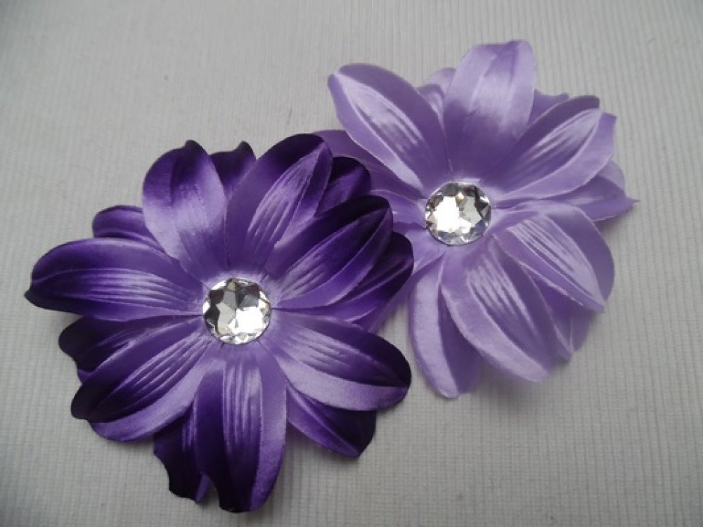 1 Grosse fleur violette de 12.5cm en tissus satiné à 2 paliers avec strass à facette central de 22mm pince recto