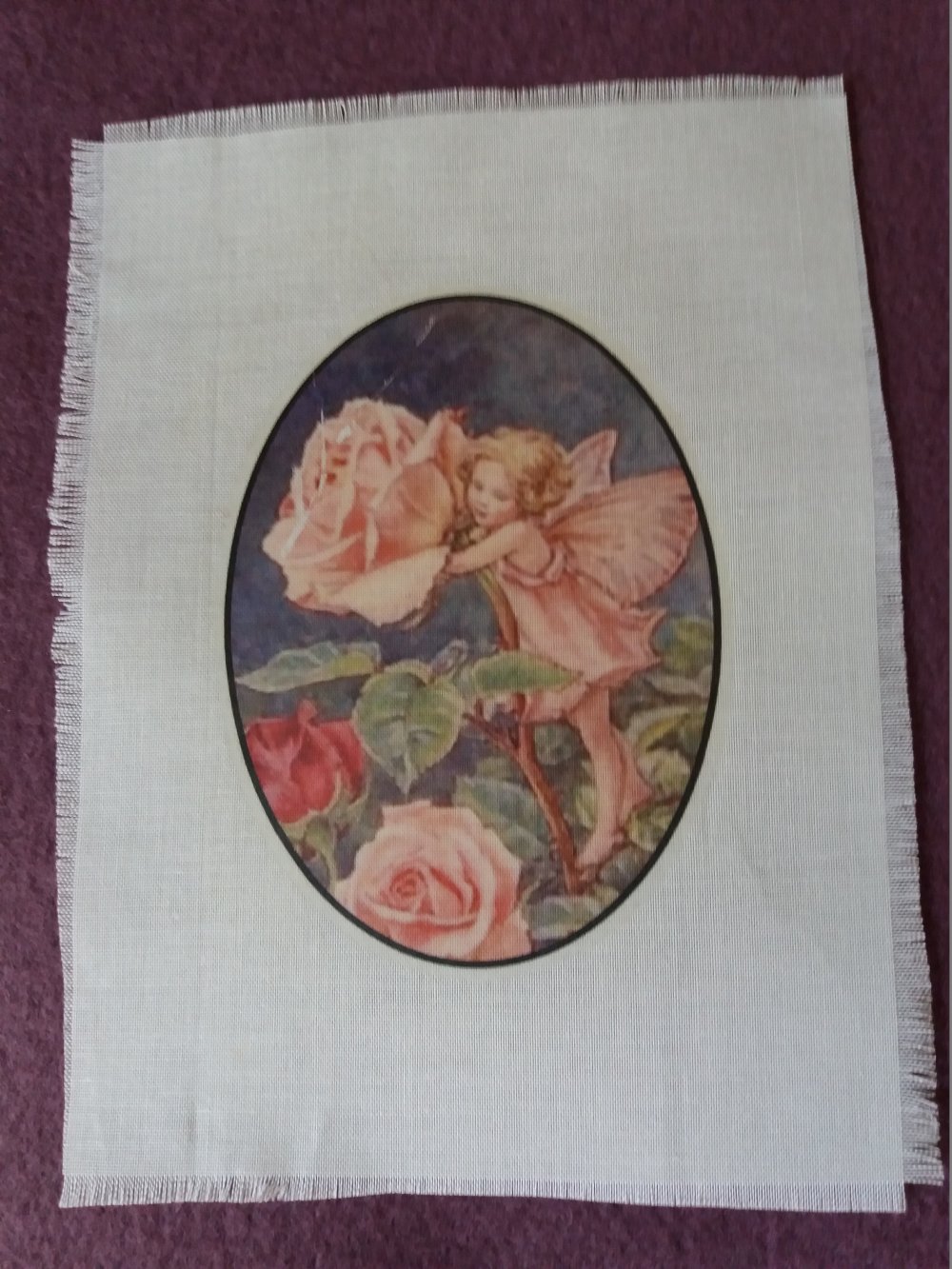 Illustration petite fée à la rose transférée sur tissu coton écru