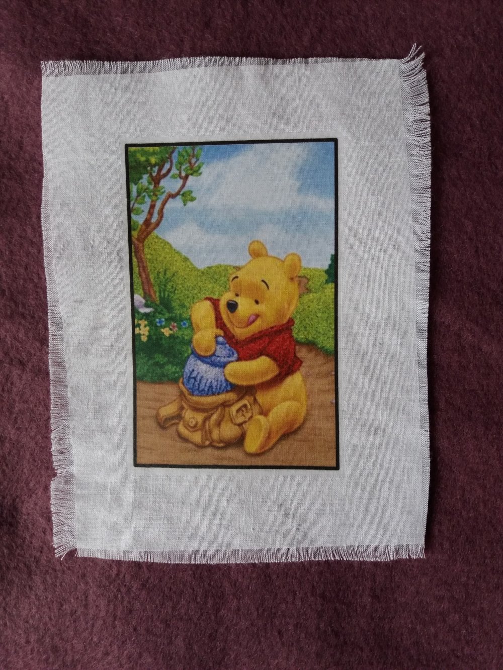 Je vous propose ce transfert d'une image ourson et pot de miel effectué sur un tissu en coton blanc.
