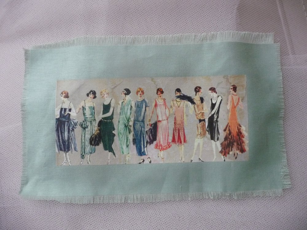 Magnifique illustration de jeunes femmes rétro, Années Folles, en robe de soirée soulignant l'élégance et la liberté des années 1900, transférée sur un tissu en coton vert.