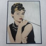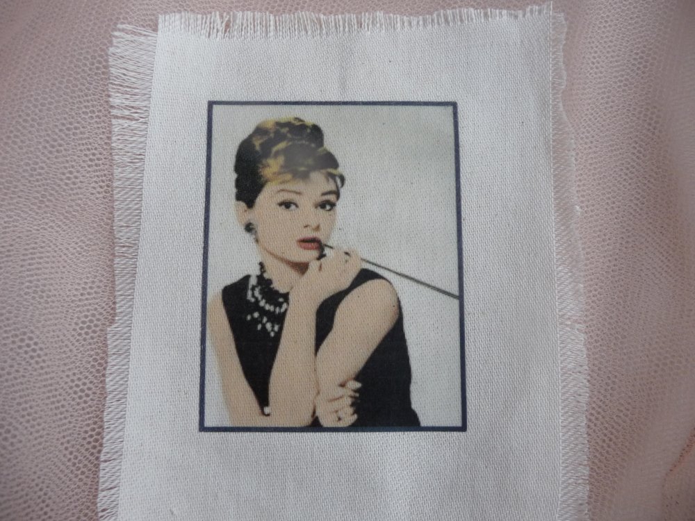 Portrait d'Audrey Hepburn transféré sur tissu coton assez épais couleur écrue