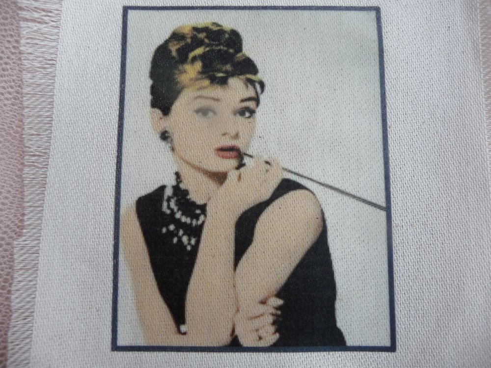 Voici un joli portrait d'Audrey Hepburn transféré sur un tissu en coton assez épais couleur écrue.