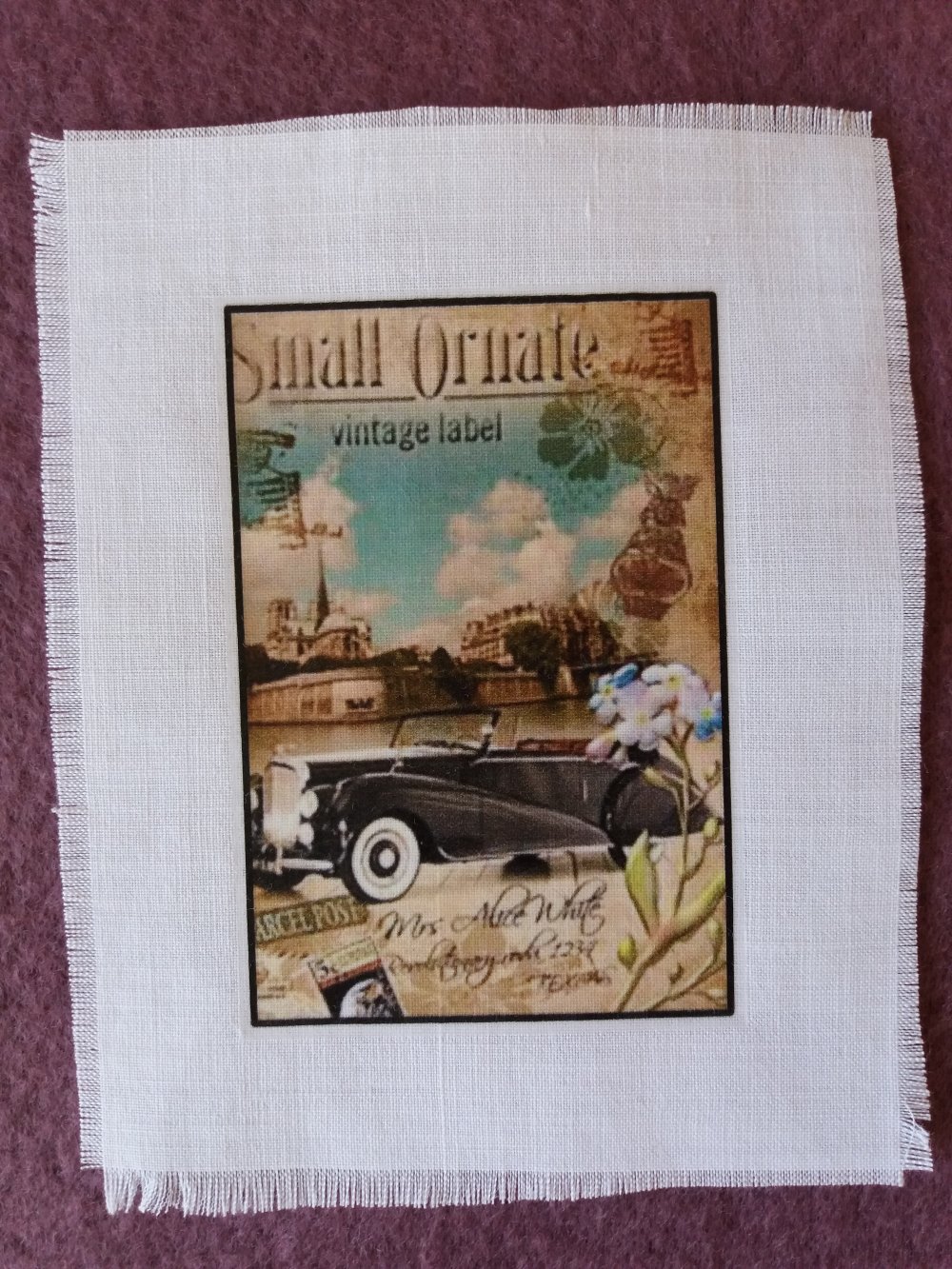 Je vous propose une petite illustration avec véhicule ancien, nature, petites inscriptions, ... transférée sur tissu en coton blanc.
