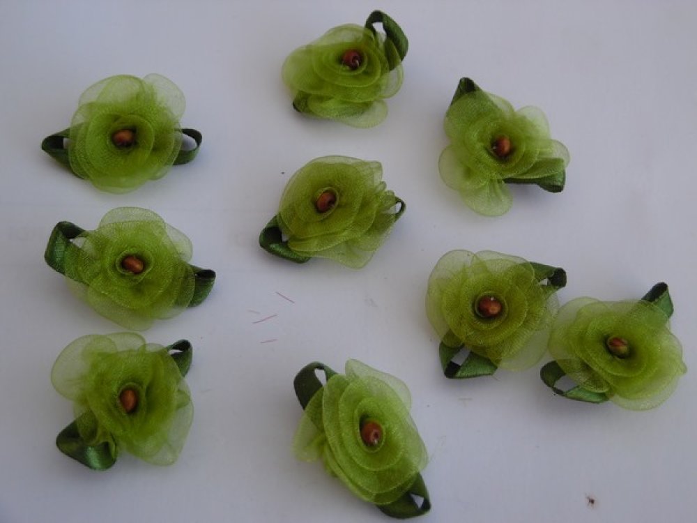 Lot de 3 Fleurs kaki et verte en organza sur 3 paliers 3.5cm