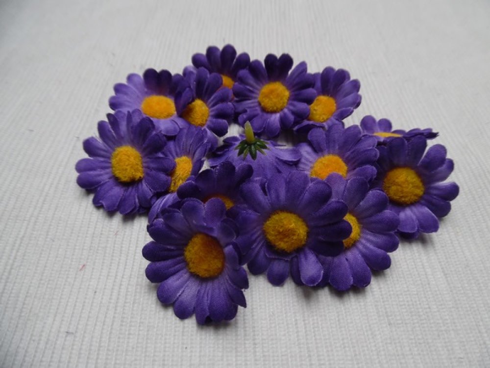 Lot de 4 fleurs marguerite pâquerette violet jaune 4cm Socle Tige à trou plastique pouvant être ôté, polyester