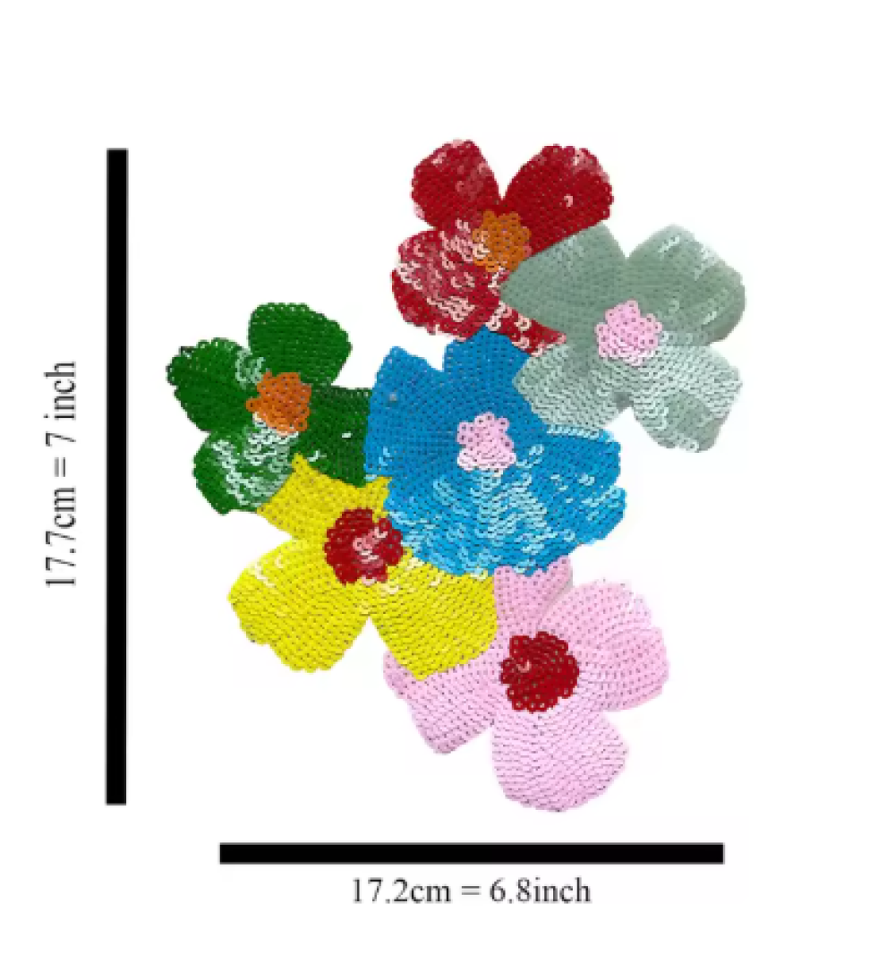 Patch à repasser, à coudre et/ou à coller représentant un joli dégradé de fleurs de couleurs différentes en sequins qui brillent. A porter sur l'épaule et le buste d'un tee-shirt ou d'une veste.