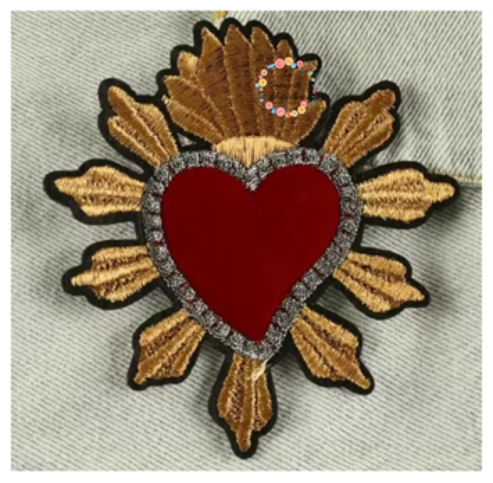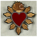 Patch représentant un ex-voto composé d'un cœur en velours rouge bordé de fils d'argent et entouré de flammes brodées de couleur dorée.