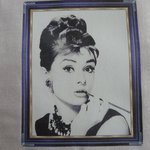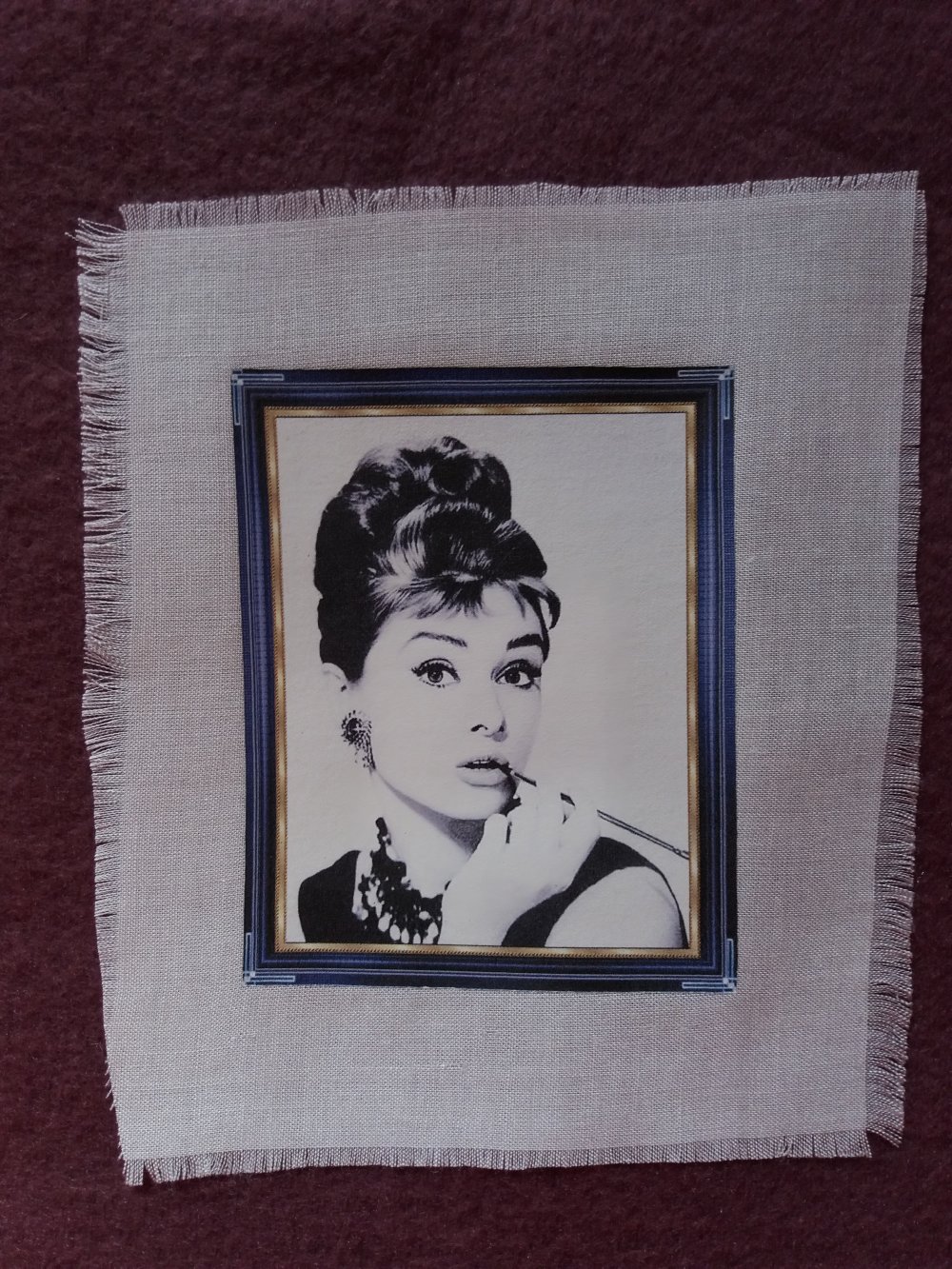 Portrait d'Audrey Hepburn cadre bleu transféré sur tissu coton fin couleur écrueche