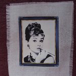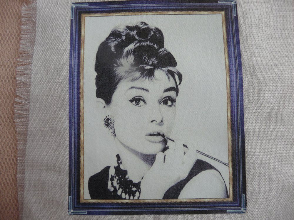 Voici un joli portrait d'Audrey Hepburn transféré sur un tissu en coton fin couleur écrue.