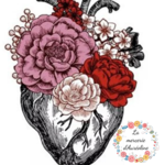 Transfert pour textile représentant un coeur anatomique de couleurs rouge et rose avec un bouquet de fleurs ; Le transfert mesure 19cm x 14,4cm
