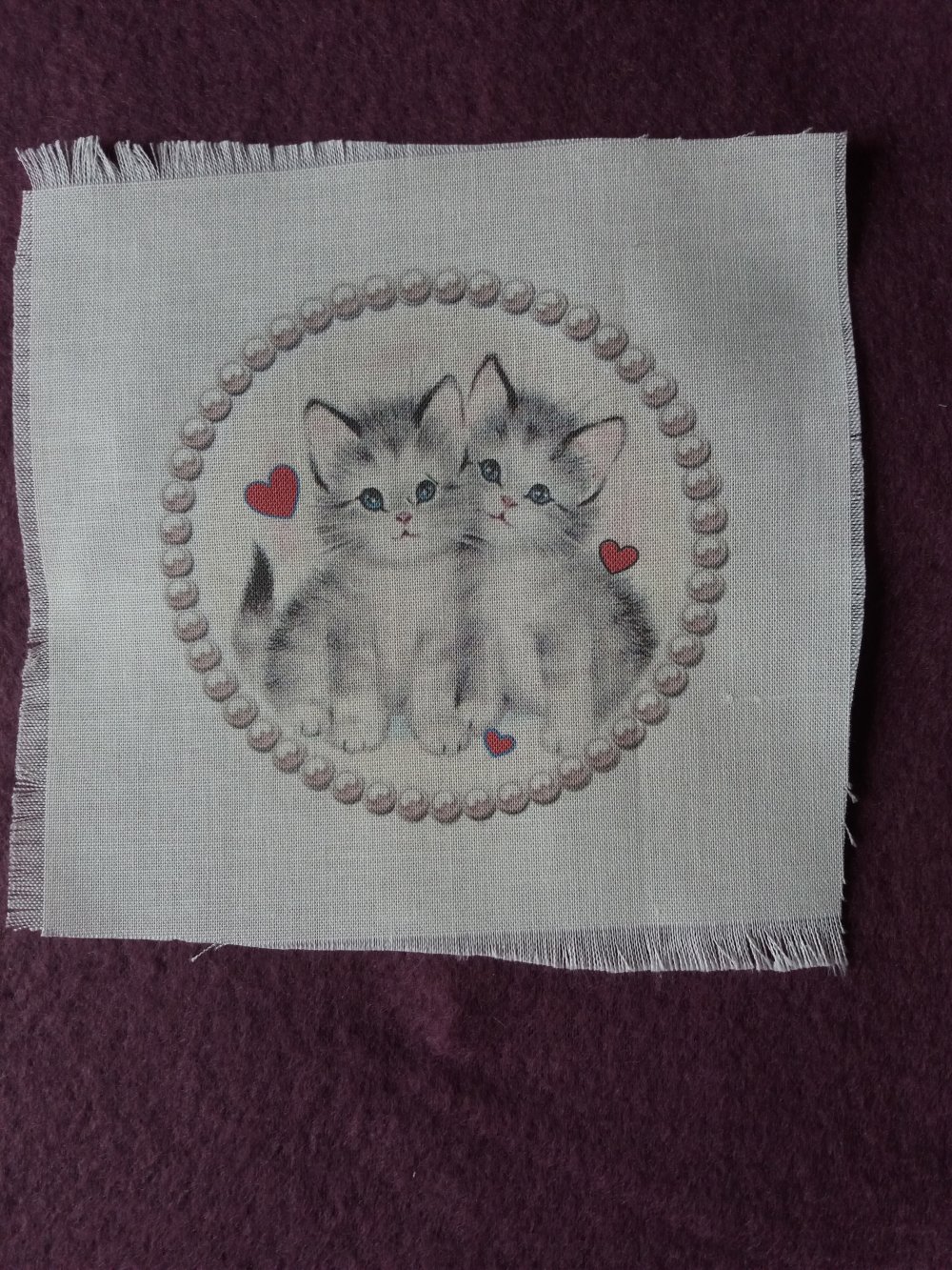 Je vous propose ce transfert d'une image représentant 2 adorables chatons dans un cadre-perles, imprimée sur un tissu en coton couleur écrue.