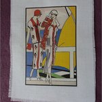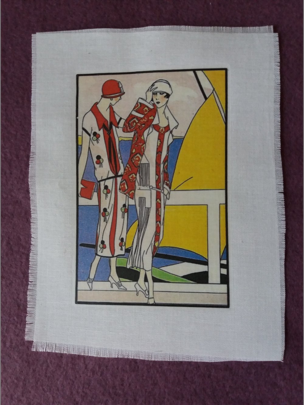 Je vous propose cette illustration de deux jeunes femmes rétro, années 1930, en tenue estivale au bord de la mer; transférée sur un tissu en coton écru. Aspect plastifié (le transfert laisse une légère pellicule brillante sur l'image).