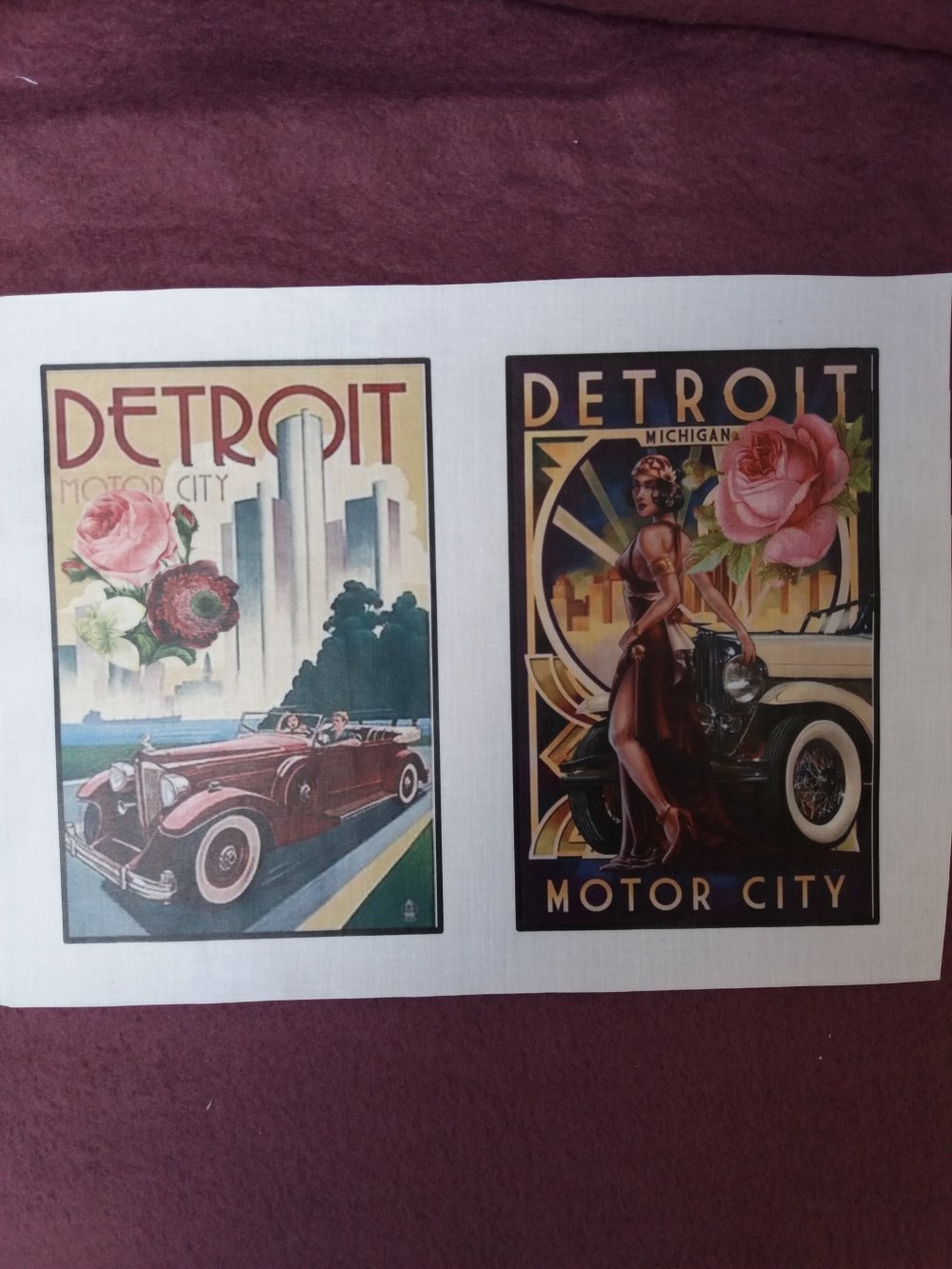 Je vous propose deux images disposées côte à côte sur un même tissu (possible de les séparer, selon vos projets créatifs), dans le style Art Déco, avec voitures anciennes transférées sur un tissu en coton blanc.