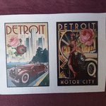 2 illustrations style Art Déco avec voitures anciennes transférées sur tissu coton blancTransfert