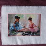 Jolie illustration de deux petites danseuses en tutu, avec petit chat, transférée sur tissu coton blanc.