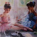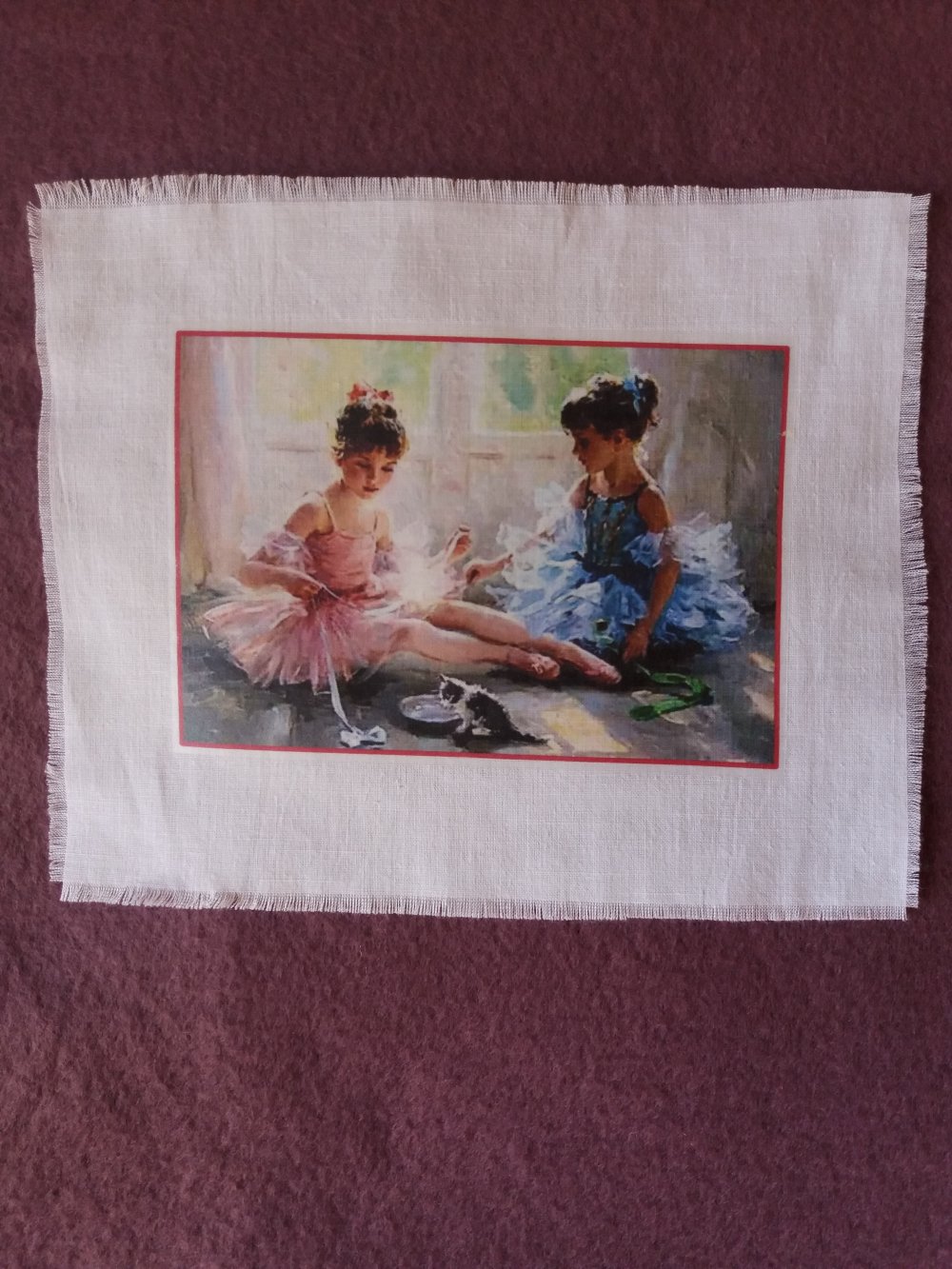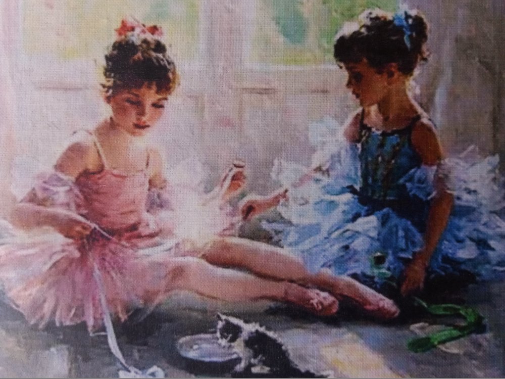 Jolie illustration de deux petites danseuses en tutu, avec petit chat, transférée sur tissu coton blanc. Aspect légèrement plastifié (le transfert laisse une fine pellicule sur l'image).