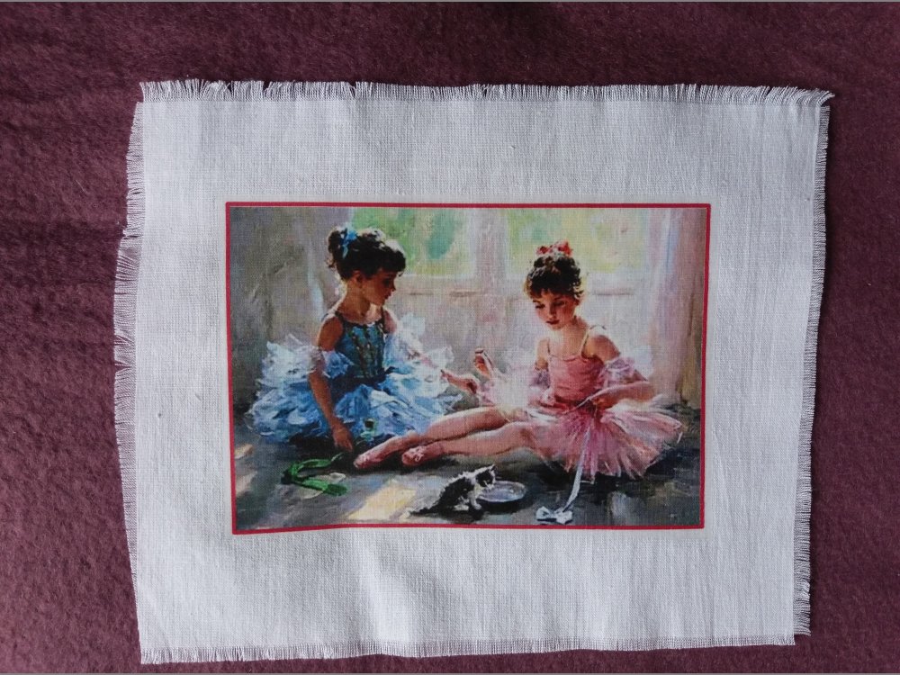 Illustration de 2 petites danseuses classiques transférée sur tissu en coton fin blanc